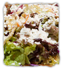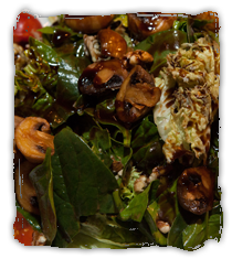 με φρέσκα φύλλα από σπανάκι και ρόκα, σωταρισμένα μανιτάρια, ντοματίνια και τριμμένο καρύδι και γλυκόξινη βινεγκρέτ