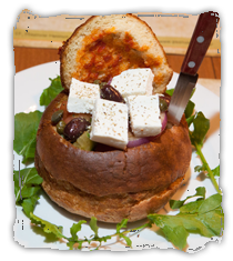 χωριάτικη σαλάτα μέσα σε ζεστό ψωμί καρβέλι ψημένο στον ξυλόφουρνο με λιαστή ντομάτα και ξύδι μπαλσάμικο
